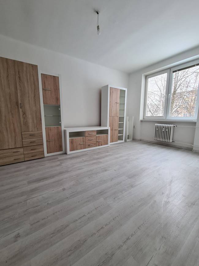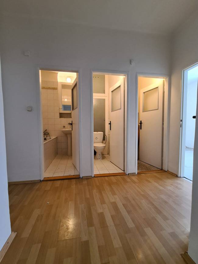 Kúpeľňa je murovaná s vaňou a murovaným samostatným WC. V celom byte sú vyššie stropy ako je štandard. Vstupná chodba a miestnosti sú priestranné, dve miestnosti sú prechodné, ale nemusia byť, pretože samostatný vstup je aj z chodby (takže stačí zamurovať prechodnú jednu časť medzi izbami). Čo sa týka stavu bytu tak boli v roku 2018 menené plastové okná v celom byte, plus žalúzie a sieťky proti hmyzu. Koncom roka 2025 sa robili nové stierky a maľovalo sa na bielo + v dvoch izbách sa menili nové laminátové podlahy, zachovali sa však aj pôvodné drevené parkety v izbách. Odstránila sa pôvodná kuchynská linka. Vonkajšie bytové dvere sa menili taktiež koncom roku 2025. Byt je inak v pôvodnom (rozvody elektriky, odpadu, vody pôvodná kúpeľňa a WC, interiérové dvere) stave, ktorý je čistý, udržiavaný a byt pôsobí veľmi dobrým svetlým dojmom. Nábytok, ktorý sa nachádza v byte môže ostať, prípadne sa byt vyprace - je to na dohode.