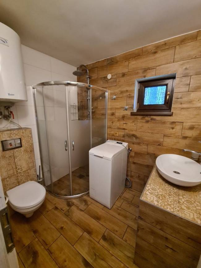 • Komplet zrekonštruovaná kúpeľňa s oknom, spoločná s WC. V kúpeľni je sprchový kút. Nachádza sa tam aj práčka a el. bojler na ohrev vody.