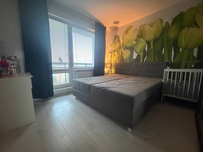 Okná sú plastové a pred 2 rokmi bola robená komplet revízia okien. V kuchyni a spálni sú žalúzie a v obývačke je tieniaci záves. V celom byte sú biele stierky + strop (veľmi dobrý stav). Podlahy sú v kuchyni a izbách jednotné, bledé laminátové, na chodbe je štýlová veľkoplošná dlažba. Na chodbe sú 2 vkusné, biele vstavané skrine na mieru s dostatkom úložného priestoru. Kuchyňa je so samostatnou špajzou a kuchyňa má aj jedálenskú časť. Kuchynská linka je zánovná a má plynovú varnú dosku, digestor, umývačku riadu, elektrickú rúru, nerezové umývadlo s batériou. Jadro je murované, kúpeľňa je s vaňou a samostatné WC je aj s umývadlom. Elektrické rozvody sú čiastočne menené a to v jadre a v kuchynskej linke. Interiérové dvere sú menené za vkusné biele z oceľovou zárubňou. Vchodové bytové dvere sú bezpečnostné. Obývačka je prechodná so spálňou. Z tohto bytu sa dá urobiť zmenou dispozície aj plnohodnotný 3 izbový byt.