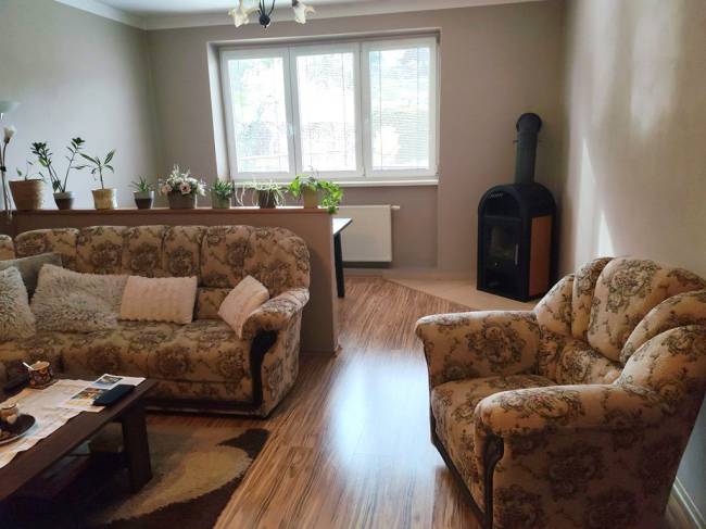 Veľmi zaujímavá ponuka zrekonštruovaného 3-izbového bytu s veľkorysou výmerou 91 m2, ktorý očarí každého kto hľadá bývanie v tichom a zelenom prostredí. Tento byt sa nachádza v kúpeľnom meste Brusno a z lodžie je pekný výhľad na rieku Hron. Prešiel kompletnou rekonštrukciou vrátane nových elektrických rozvodov a praktickou zmenou dispozície. Nachádza sa na 1. podlaží v len 2-podlažnom bytovom dome. Pod oknami nie sú chodníky, ale zeleň a park so stromami a detským ihriskom, ktoré sú vo vlastníctve obyvateľov bytového domu. K dispozícii je aj kočikáreň. Bytový dom má Spoločenstvo vlastníkov bytov a spravujú si bytový dom sami. Každý byt má vlastné samostatné kúrenie plynovým kotlom a každý byt si aj sám ohrieva vodu. V byte je aj piecka na tuhé palivo. K bytu prislúcha aj pivnica. Byt sa predáva zariadený (podľa priložených fotiek ) a po dohode s majiteľom bytu a je kúpou voľný. Byt pozostáva s predsiene, 3 izieb, peknej kuchyne, komory (špajze), kúpeľne so sprchovým kútom, WC a lodžie.
