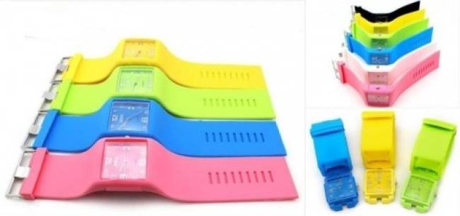 Predám nové dizajnovo a farebne zaujímavo riešené športové silikonové digitálne hodinky tzv. BIG FACE s výrazným ciferníkom veľkosti 4x4 cm. Pevný silikonový remienok dĺžky 23 cm, váha len 60g, vo farbe žltá, červená, modrá, ružová a oranžová, príjemné na nosenie. Hodinky umožňujú vzájomne kombinovať ciferník a remienok rôznych farieb !